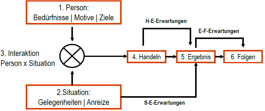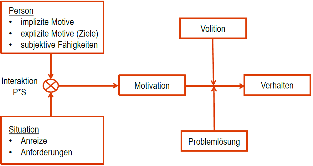 | Motivation | Motiv x Anreiz (Produkt); aktuelle Anregung von Motiven durch tatsächliche oder vorgestellte situative Anreize→ Verhalten resultiert nur bei vorliegendem Motiv undpassendem Anreiz→ Prozess, der zielgerichtetes Handeln auslöst und aufrecht erhält |