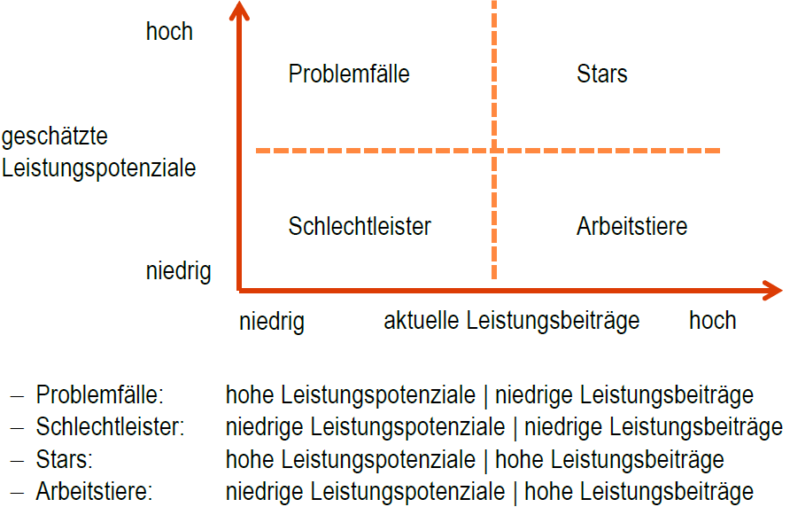 | Instrumente zur Ermittlung des Leistungspotenzials von Mitarbeitern | •Personalakten, Personaldateien •Mitarbeiterbeurteilungen, Mitarbeitergespräche, Zielvereinbarungen •Befragungen von Führungskräften und Mitarbeitern •Assessment Center •Management Audits= zielgerichtetes Interview zur Festlegung von Personal-entwicklungsmaßnahmen für Führungskräfte (meist durch externe Personalberater) |