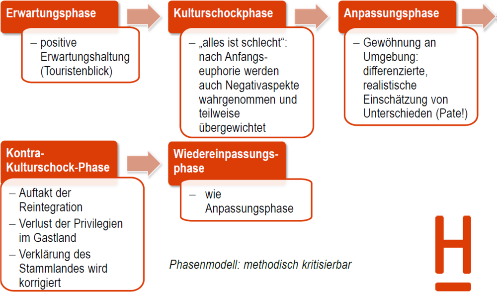 | Auslandsentsendung | Reintegration | −häufig unterschätzte Phase: ebenso mühsam wie die Entsendung −Probleme •Überlegungen über die berufliche Reintegration werden erst bei der Rückkehr angestellt -Bereitschaft für Auslandsaufenthalte sinkt auch bei anderen Mitarbeitern -befürchten Karrierenachteile •Unternehmen befindet sich im ständigen Wandel -Strukturen verändern sich -informelle Beziehungen haben gelitten etc. •häufig geringerer Status und weniger Privilegien als im Gastland •betriebliches und fachliches Wissen ist mittlerweile veraltet •Desinteresse der „Daheimgebliebenen“, schlimmer noch sind Neid und Zurückweisung |