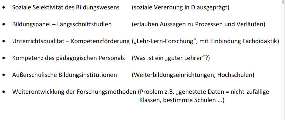 | I.1*Einleitung* Definition des dt.Bildungsrates 1974–EBF (3 Punkte) | 1. Engerer Sinn: Unterrichtsforschung 2. Weiterer Sinn: Betrachtet gesamtes Bildungswesen, dessen Reform im Kontext Staat und Gesellschaft, außerschulische Bildungsprozesse. 3. nur „Bildungsforschung“, wenn Gegenstand der Forschung Bildungsprozesse, deren ökonomische oder organisatorische Voraussetzungen bzw. Reformen sind. |