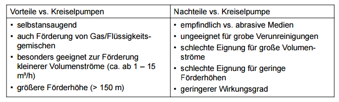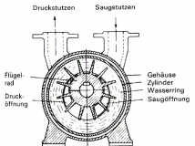 Flüssigkeitsringpumpe: Eine der am häufigsten verwendeten Vakuumpumpen. Förderung großer Gasvolumina in kurzer Zeit. Enddrücke 25…40 mbar (Wasser als Sperrflüssigkeit) Funktionsprinzip: exzentrisches Flügelrad dreht sich in Sperrflüssigkeit – Flüssigkeitsring entsteht – Abtrennung versch. großer Hohlräume. Ölfrei, geringe Anschaffungs-, Betriebs- und Entsorgungskosten.