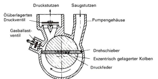 Vakuumpumpen Drehschieberpumpe Verwendung v.a. in Labor und Technikum. Enddrücke < 1 mbar. Geringes Saugvermögen.I.d.R. Motorölschmierung, hohe Betriebs- und Entsorgungskosten. Funktionsprinzip: druch Drehen des exzentrischen Kolbens mit Abdichtung durch federbelastete Sperrschieber entsteht durch Raumvergrößerung Unterdruck auf der Saugseite und Überdruck auf der Druckseite.