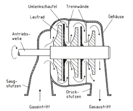 Turboverdichter Gasstrom wird im Zentrifugalfeld des Laufrads beschleunigt. Beim Auftreffen des Stroms auf die Umlenkschaufel wird kinetische Energie in Druck umgewandelt. Volumenströme bis 1000000 m³/h, Drücke bei 10-stufigen Axialverdichtern bis zu 40 bar, bei Radialverdichtern bis zu 300 bar.