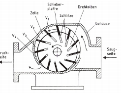Drehkolbenverdichter Komprimierung durch sich bei der Drehung verkleinernde Zellen (abgedichtet durch Schieberplatten) am exzentrisch angebrachten Drehkolben. Gleichmäßiger Förderstrom, geringe Abmessungen. Schlechte Abführung der Kompressionswärme. Schmierung/Abdichtung mit Öl. Einstufige Bauart ca. 5 bar, zweistufige mit Zwischenkühlung ca. 10 bar.