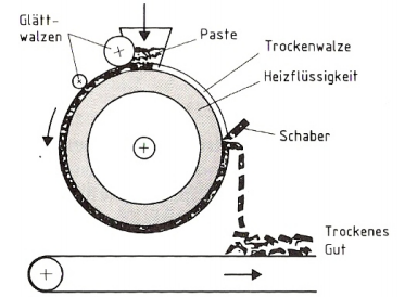• für dünnflüssige, hochviskose bis pastöse Produkte • Walzen meist von innen mit kondensierendem Dampf beheizt • Produkt trocknet als dünner Film durch Kontakt mit Walzenoberfläche |