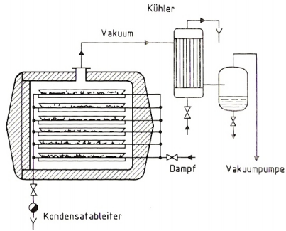 | Kontakttrocknung: | Feuchtgut wird durch Kontakt mit Heizplatten erwärmt. Dämpfe (Brüden) werden abgesaugt. |
